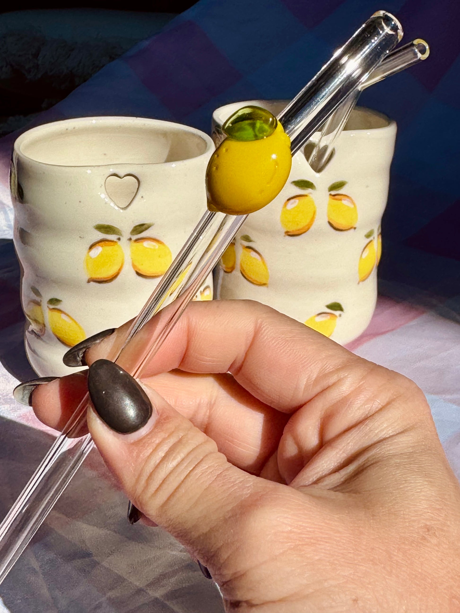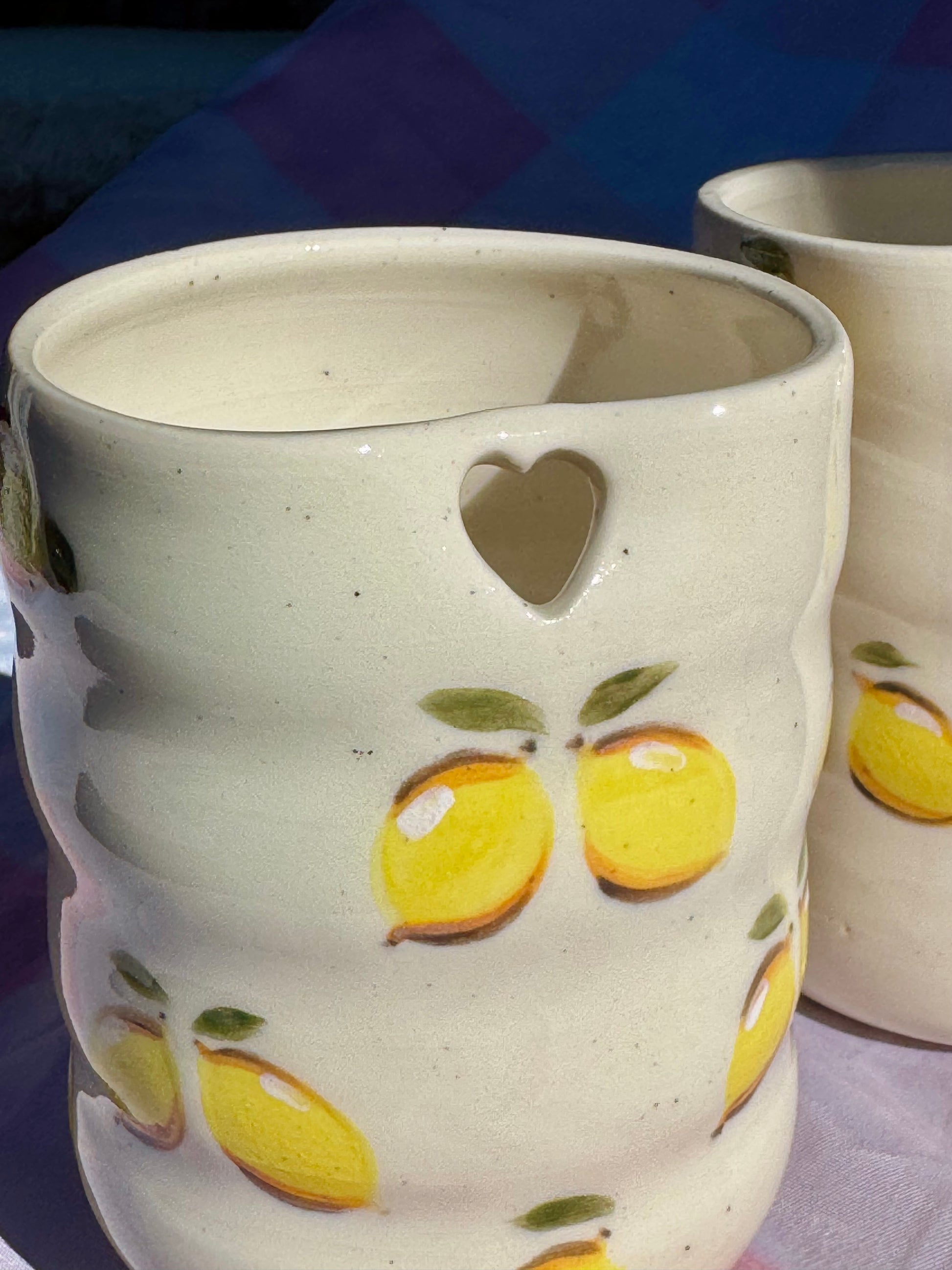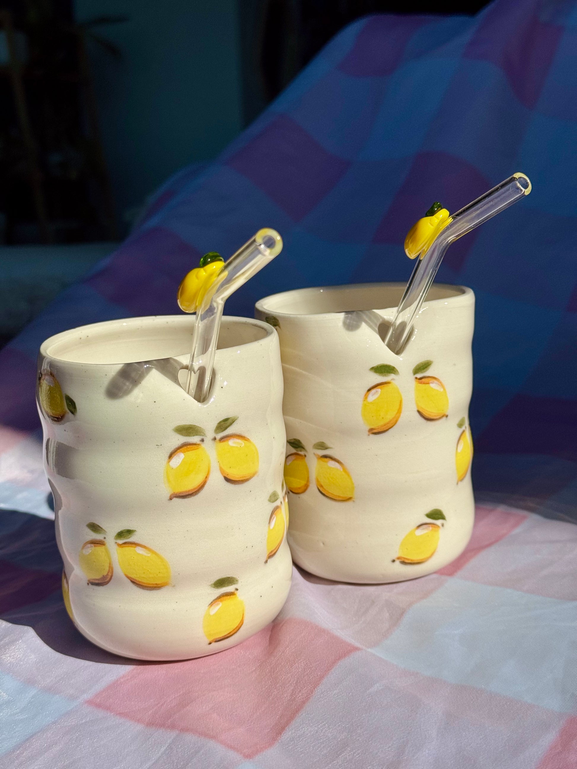 Hand painted Wheel thrown high fired stoneware. Lemon Straw included.