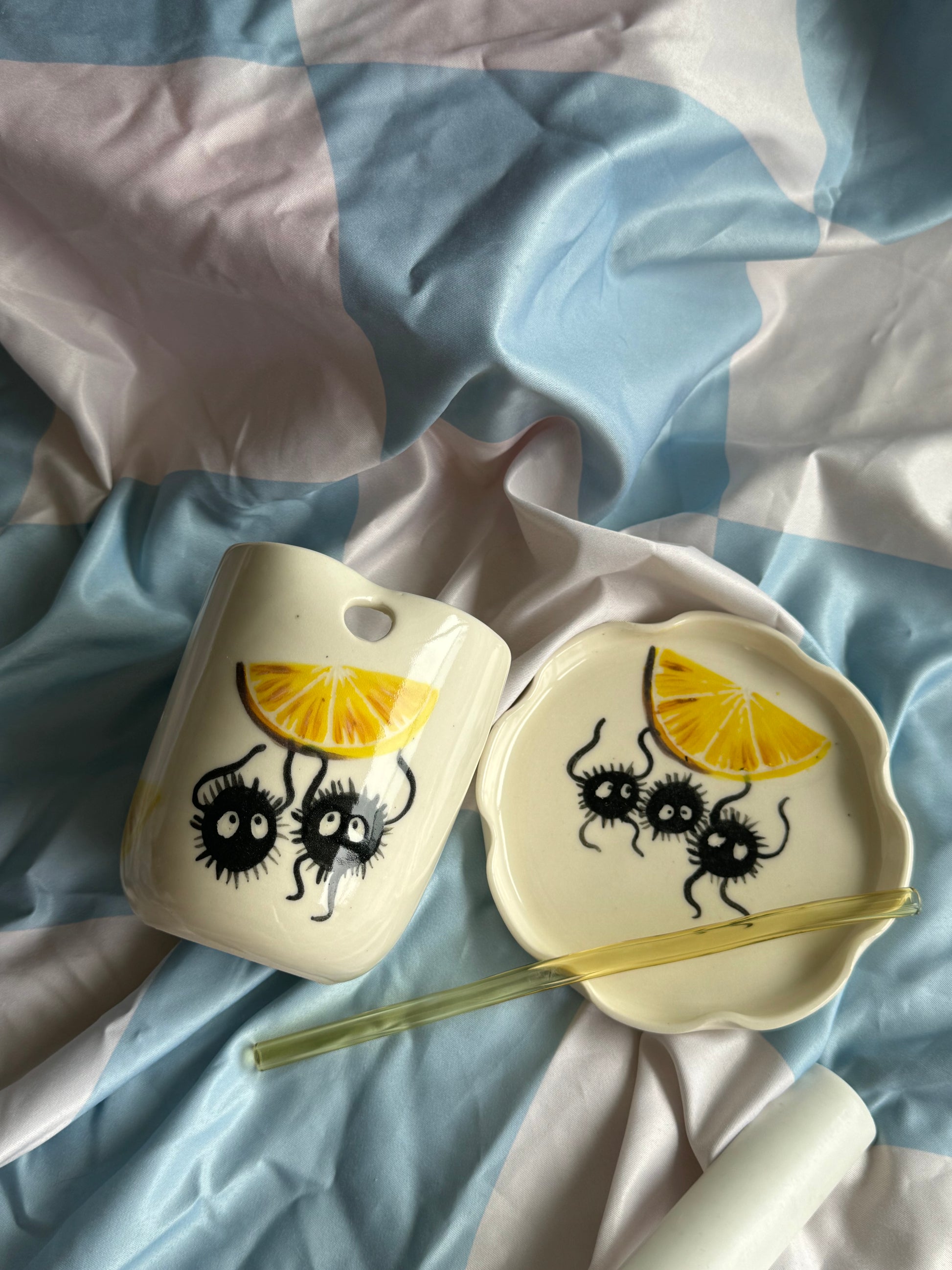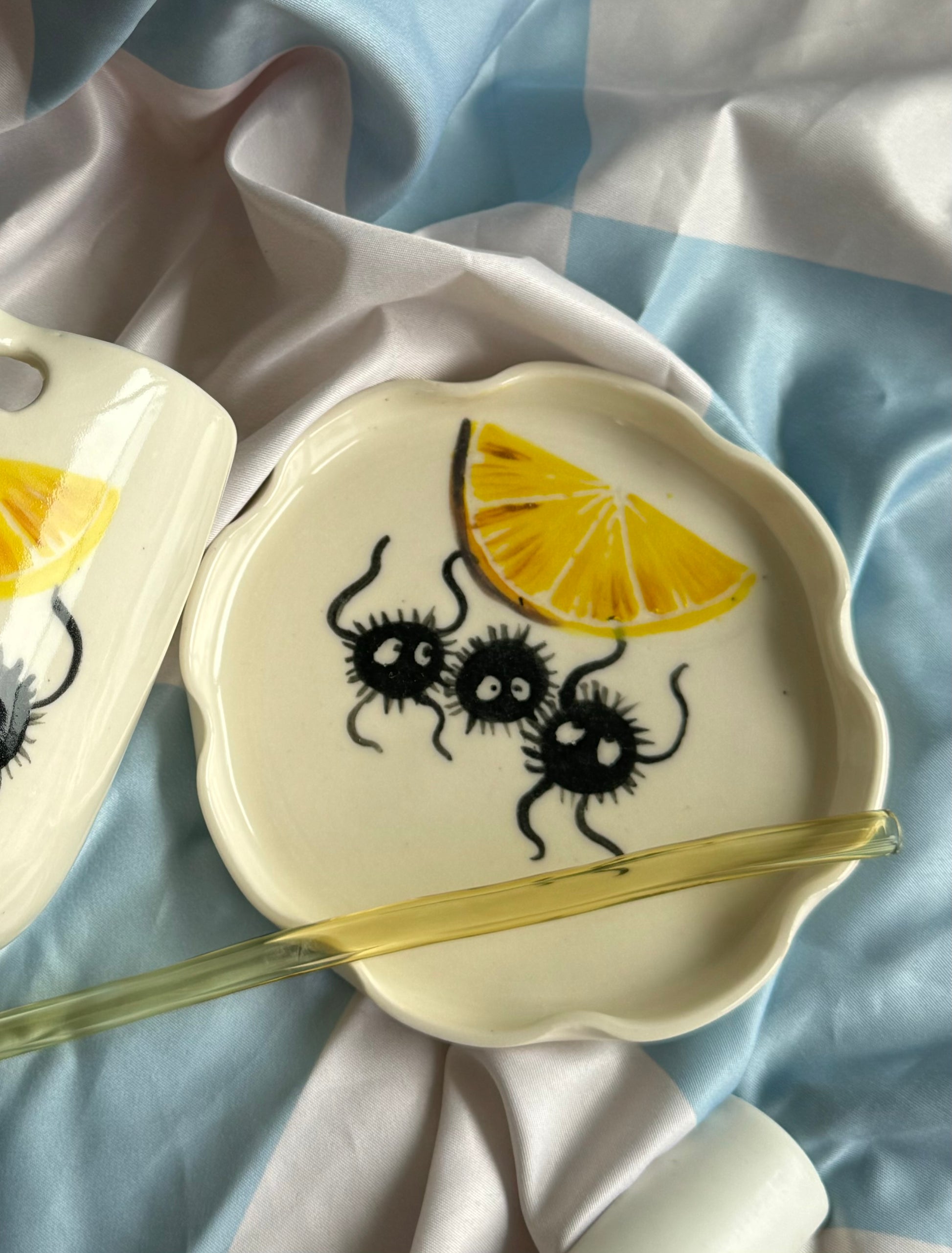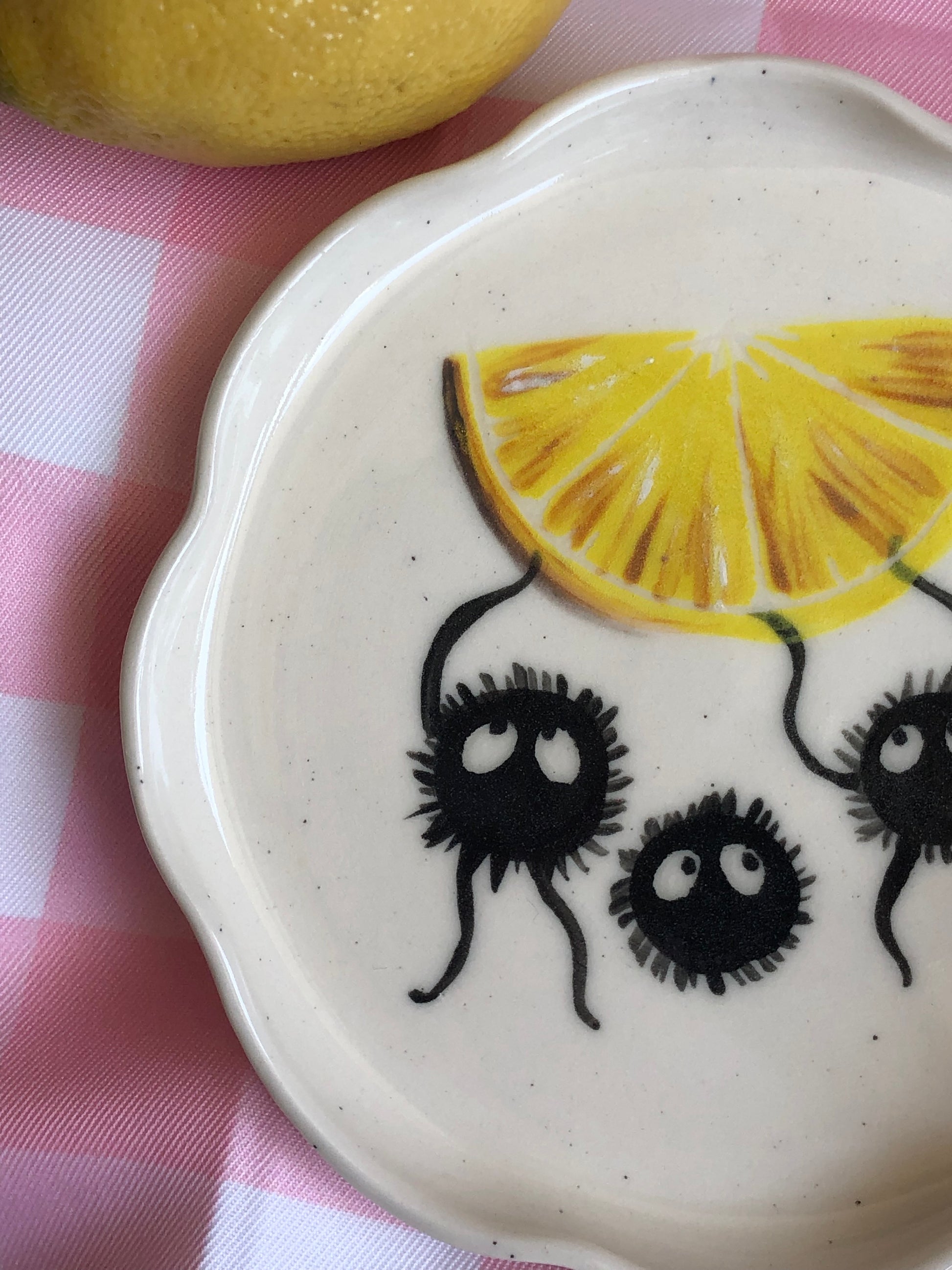 Add a touch of playful charm to your table with our handmade small stoneware plate, featuring hand-painted soot sprites and a iconic Mooody Lemon signature lemon slice. Each plate is lovingly crafted, making it a one-of-a-kind piece that blends functionality with whimsical design.