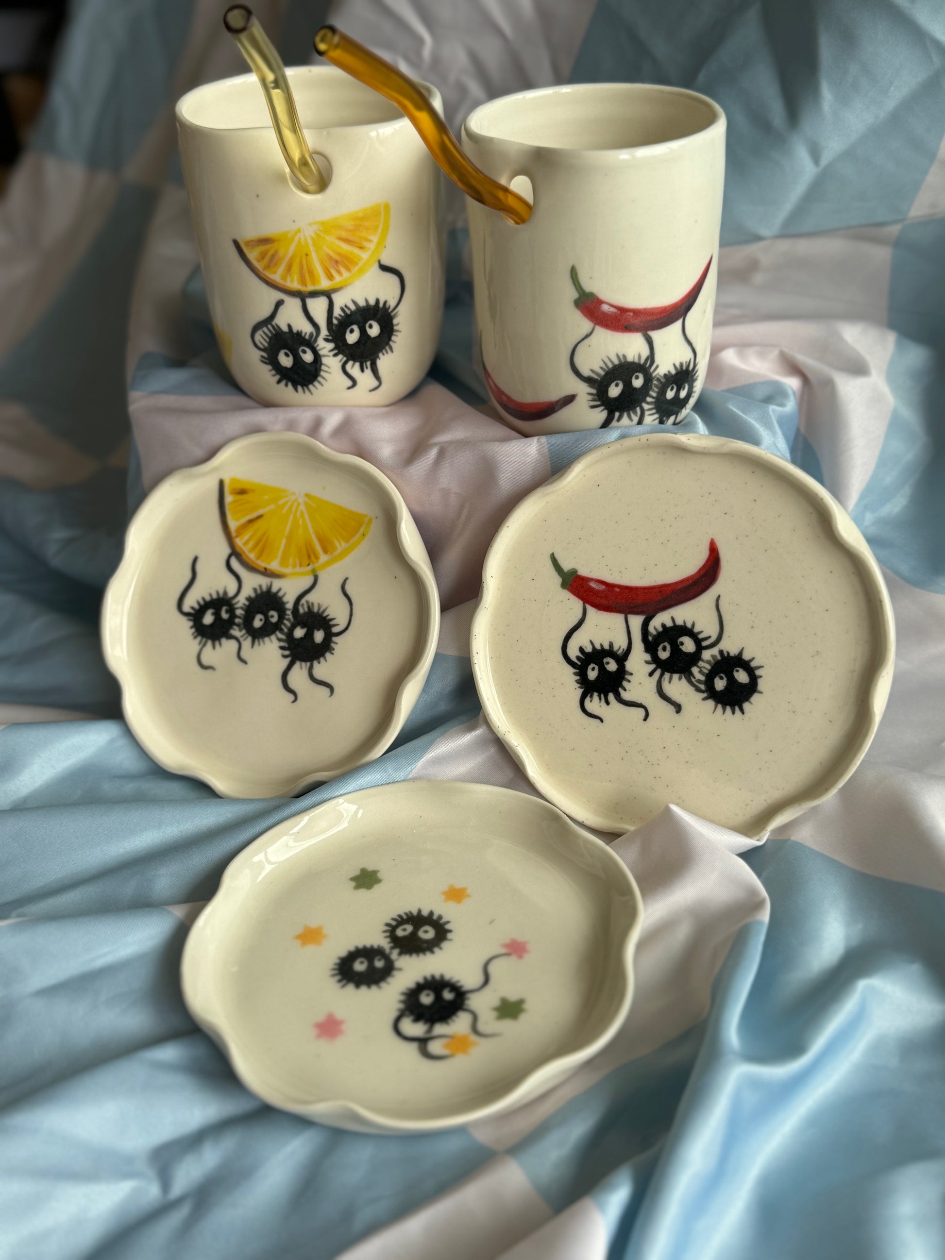 Add a touch of playful charm to your table with our handmade small stoneware plate, featuring hand-painted soot sprites and an iconic Mooody Lemon signature chillies. Each plate is lovingly crafted, making it a one-of-a-kind piece that blends functionality with whimsical design.