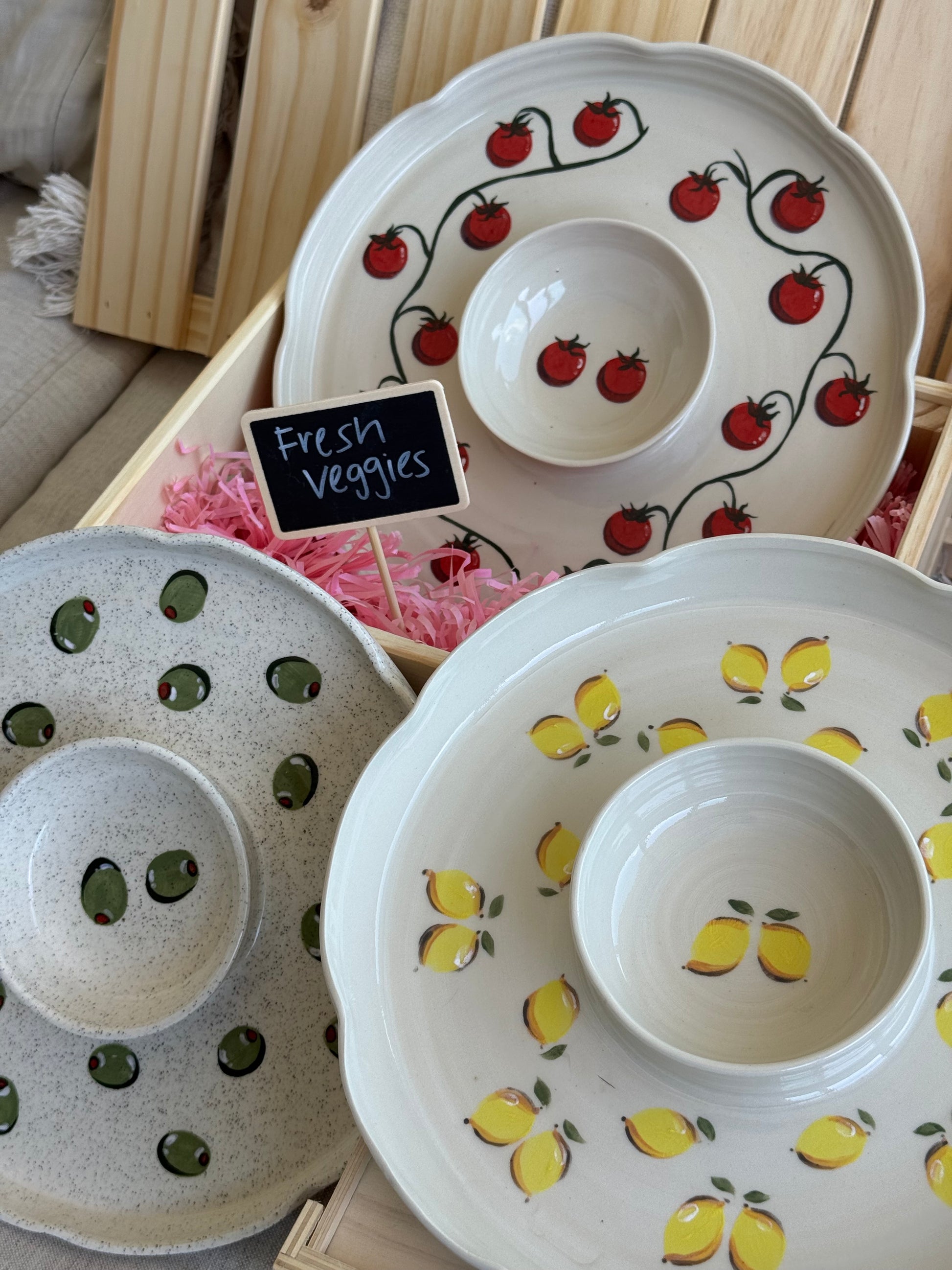 Available in Cherry, Olive, Lemon, Chilli, and Tomato — inspired by fresh produce and long, snack-filled tables. Each platter is a lucky dip between speckled or plain clay, adding to its unique character.